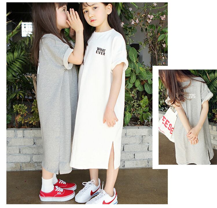 子供服 ガールズ ロング Tシャツ ワンピース 半袖 ホワイト 白 グレーコットン 綿 こども かわいい お店 通販 韓国 人気 おしゃれ オシャレ キッズ 子供 女の子 子ども 春 夏 子