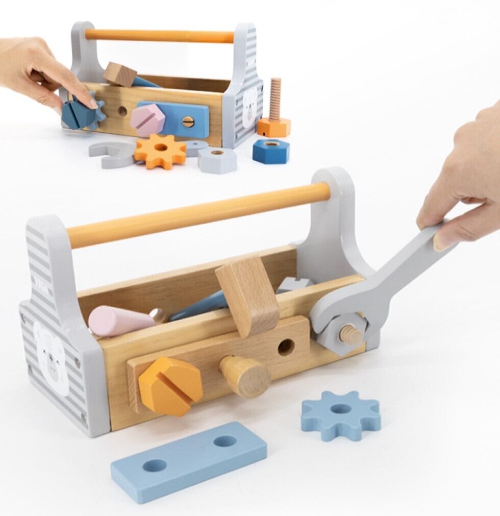 ボルトなどの部品、ドライバーなどの工具類を持ち運びできる工具箱をセットにした知育おもちゃ。